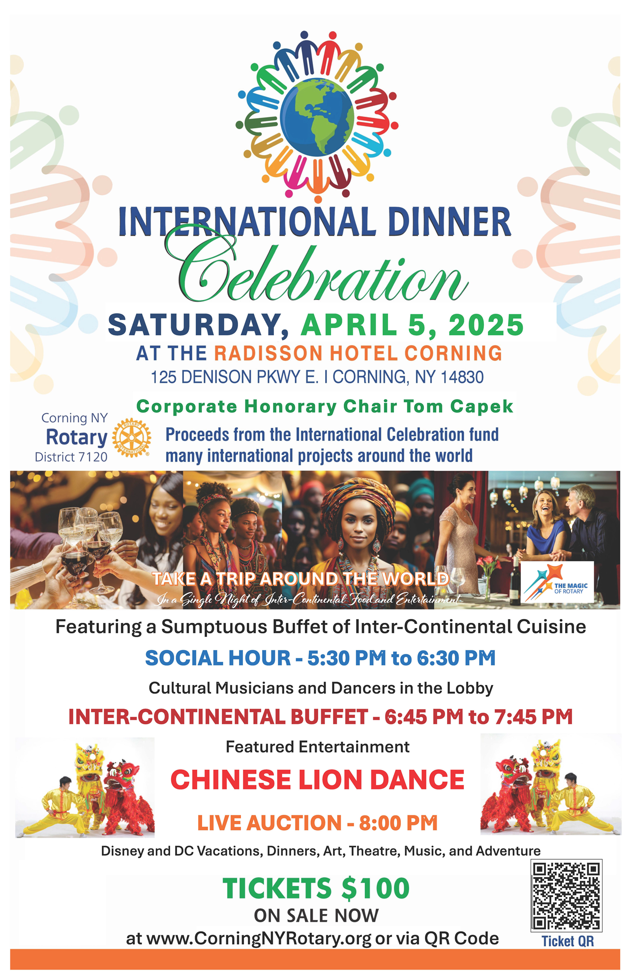 It's coming!! The Corning Rotary Club International Dinner is April 5th. Tickets and sponsorships are available now at the link below. [note that I will be showing full links - they are not pretty, but it assures you that the links are in our area. ClubRunner contains our Rotary site, so you may see ClubRunner in our links]. If online payment isn't your favorite, you can purchase your tickets or sponsorship at our first and third Thursday lunch meetings at the Radisson. You can also sign up online and then pay by check; just choose check at checkout. Please be sure to mail your check PROMPTLY. Details are here: http://portal.clubrunner.ca/7812/events/corning-rotary-international-dinner-celebrati. In some of our website areas, I will use the hidden link - you click on the words and it takes you there; note that you can place your cursor over the link and your browser will show you the true/safe link is there.  Your tickets will be held for you at the registration desk when you arrive. When you signup for a Sponsorship, we'll contact you so that we can have your preferred graphic for presentations and notices. |