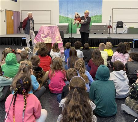 Pauleen, John and Gil read and carry on for the 1st & 2nd grades at Severn School. The book was An Old Lady who Swallowed a Rose. Pauleen and John acted out a similarly themed story starring a dog and a veterinarian. The dog also swallowed a number of inappropriate beasts. Hilarity ensued.